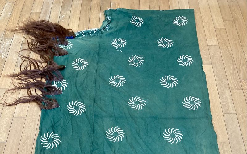 | 獅子舞衣装 左:背中側で馬の毛が付けてあります 上:前垂れ、右:正面 左上の欠けた部分に獅子頭を取付けます 白い渦巻模様は毛卍紋(けまんもん)と言い 唐獅子の巻き毛を図案化したものです |