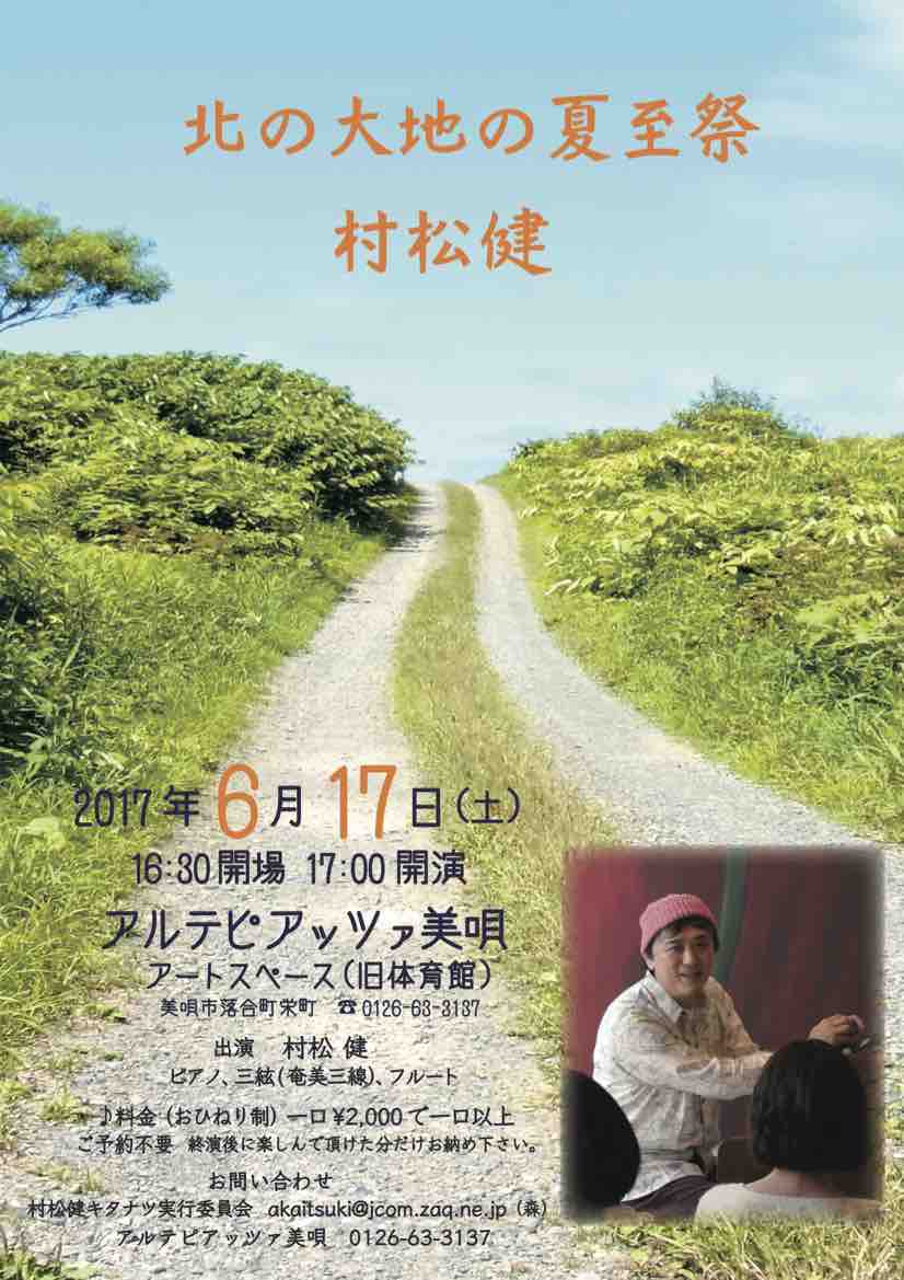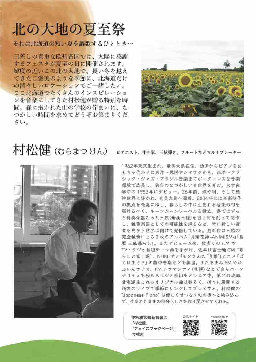 日差しの貴重な欧州各国では、太陽に感謝するフェスタが夏至の日に開催されます。緯度の近いこの北の大地で、長い冬を越えてきたご褒美のような季節に、北海道だけの清々しいロケーションでご一緒したい。ここ北海道でたくさんのインスピレーションを音楽にしてきた村松健が贈る特別な時間。森に抱かれた山の学校の佇まいに、なつかしい時間を求めてどうぞお集まりください。