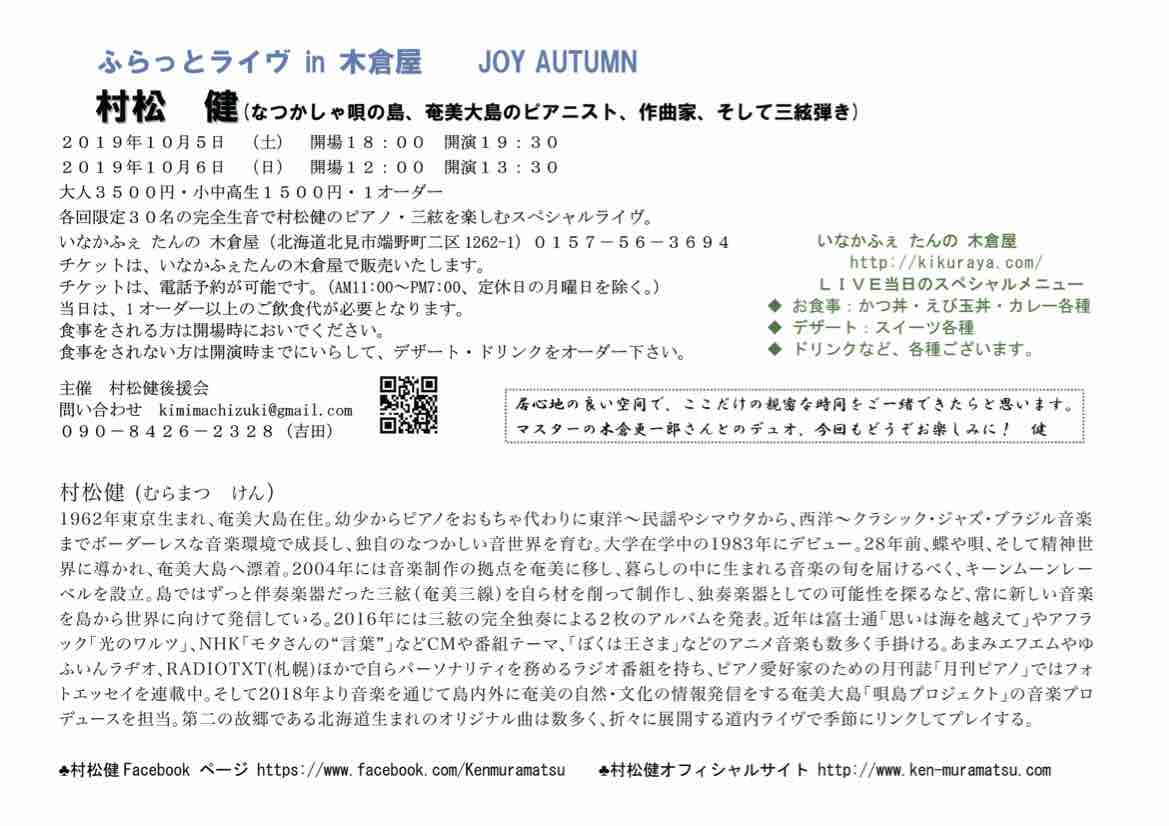 村松健 ふらっとライヴ in 木倉屋 新譜「みずのしま」発売記念“ JOY AUTUMN”