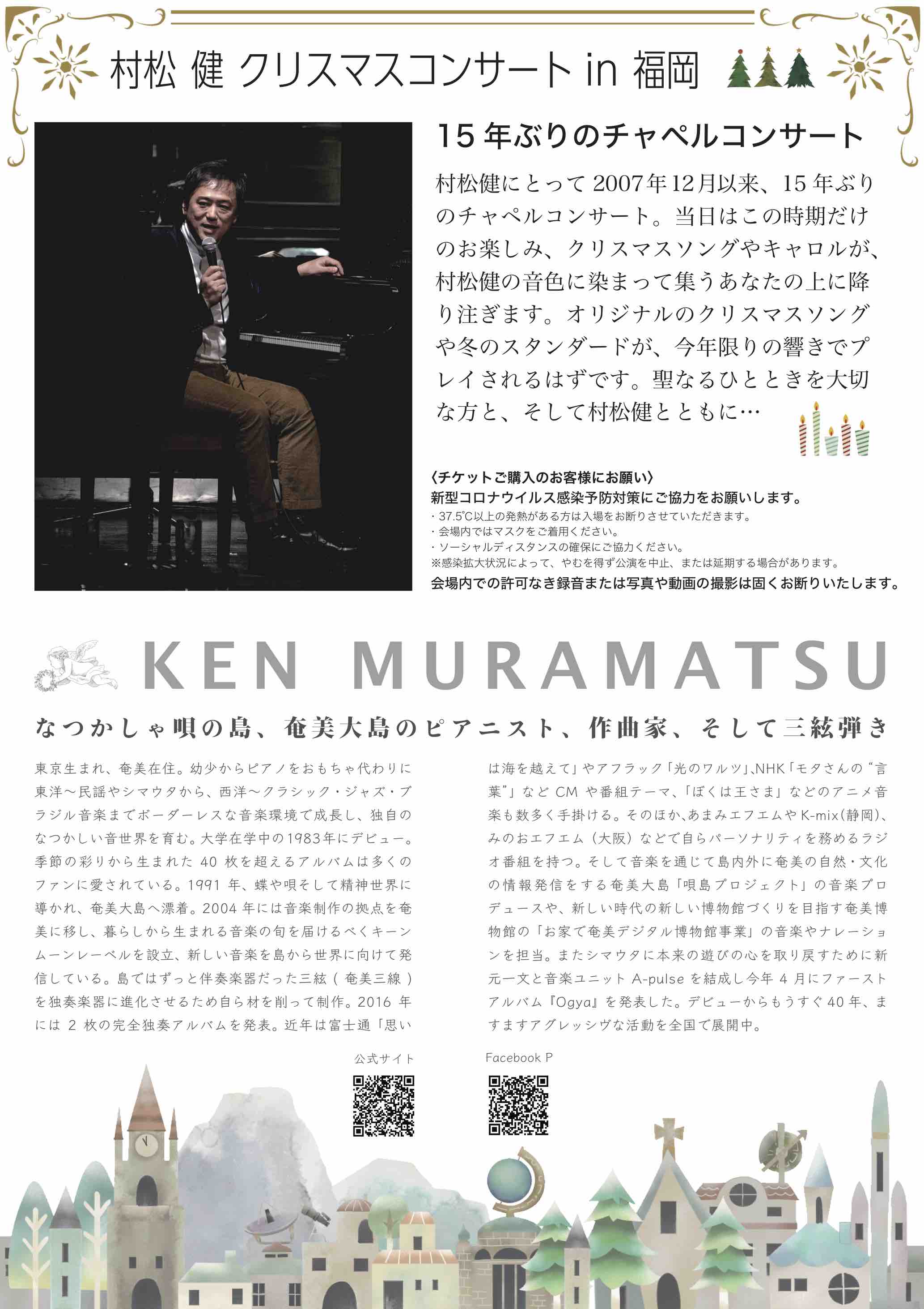 村松健にとって2007年12月以来、15年ぶりのチャペルコンサート。当日はこの時期だけのお楽しみ、クリスマスソングやキャロルが、村松健の音色に染まって集うあなたの上に降り注ぎます。オリジナルのクリスマスソングや冬のスタンダードが、今年限りの響きでプレイされるはずです。聖なるひとときを大切な方と、そして村松健とともに…