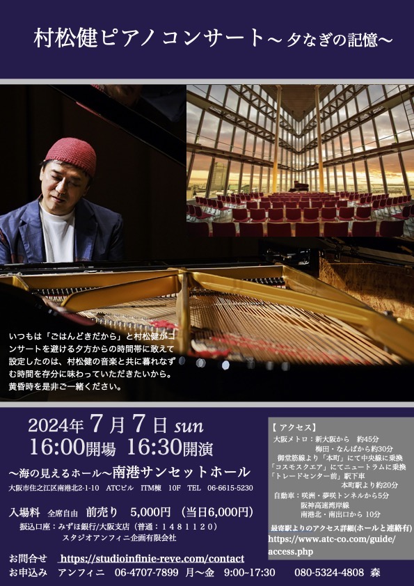 本当に久しぶりの大阪公演は、まるで船の“へさき”のような形の180度ガラス張り空間、その向こうに海が見える南港サンセットホール。この公演、いつもは「ごはんどきだから」と村松健がコンサートを避ける夕方からの時間帯に敢えて設定したのは、村松健の音楽と共に暮れなずむ時間を存分に味わっていただきたいから。スーパースペシャルな黄昏時のライヴ、どうぞお見逃しなく。
