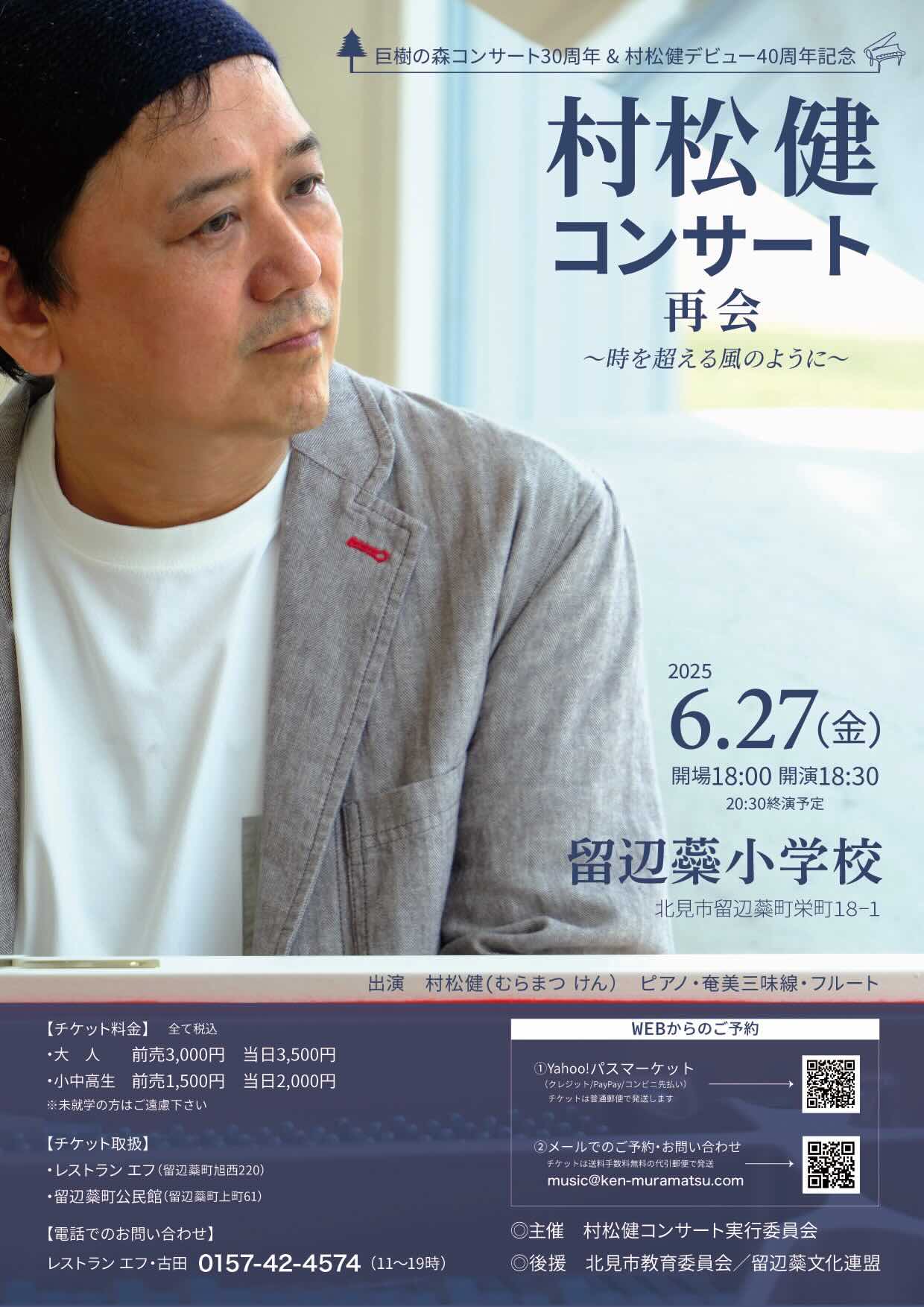 村松健は、1994年9月に旧留辺蘂町で開催された「第1回巨樹の森コンサート」でピアノ演奏をしたアーティストである。