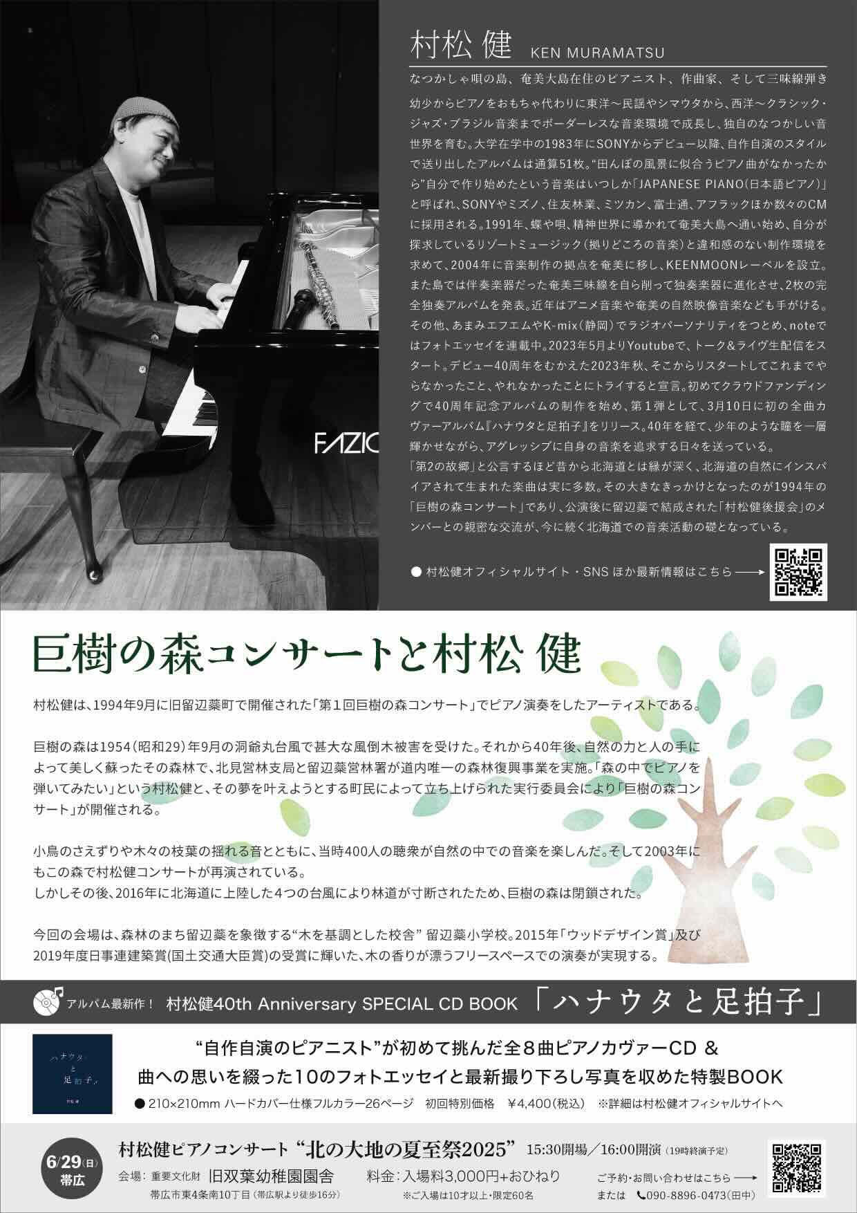 北海道・留辺蘂町は「RU・PESHU・PE- 峠みちのふもと町 -」(『水の中のピアノ』に収録)という楽曲タイトルにも表れているように、村松健にとって特別な縁で結ばれた場所です。1994年「第1回巨樹の森コンサート」出演をきっかけに、この地の有志によって「村松健後援会」が結成され、メンバーとの親密な交流が今に繋がる北海道での音楽活動の礎となっています。