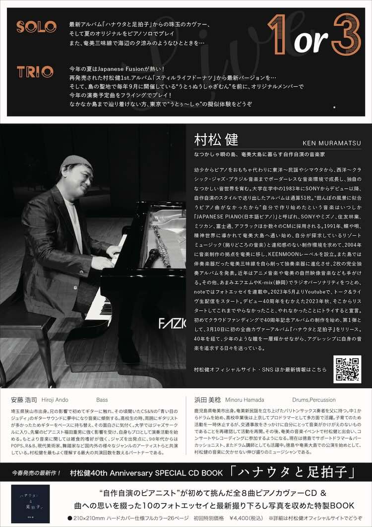 当日は、ライヴに因んだオリジナルスペシャルカクテル(ノンアルコールもあり)のほか、村松健が島から持参するとっておきのレアな黒糖焼酎もご用意しています。ぜひ音楽と共に味わってください!