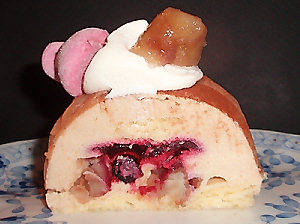 | タダシ・ヤナギ 380円税込み 「キャラメルモンブラン」 スポンジの上に洋ナシと栗1/2とスポンジの 入ったキャラメルムース。 マロンクリームとスライスした洋ナシの上に 飾りチョコとブルーベリーとフランボワーズ。 粉砂糖とココア粉。 2005.10.10