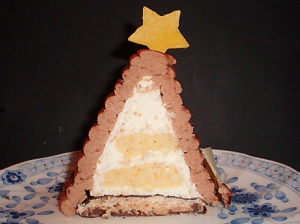 「クリスマスモンブラン」 チョココーティングした焼きメレンゲの上に スポンジ入り生クリーム。 マロンクリームの上にココア粉。 飾りのホワイトチョコ。 (期間限定) 2008.12.21