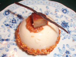 タルトの中にキャラメルクリーム。 スポンジの上にリンゴジェル バニラムースの上にマロンムース。 栗1/4と飾りのバニラビーンズ。 側面にローストナッツ。 2007.10.21