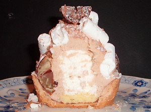 チョココートしたパイケースの中にスポンジ。 マロンクリームの中に生クリーム。 焼きメレンゲと渋川栗片。 飾りの削りチョコと粉砂糖。 2009.4.29