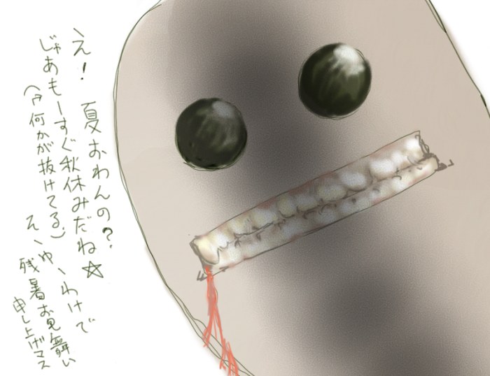 学校の友人に送った残暑見舞いメールに添付した画像。 とりあえずドアップにしとけばウケルダロウという安直な考えがワレながらアッパレ。 また、最近の大学生における学力低下を如実にあらわしているとも言える。 << >> HOME