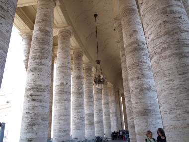 | この284本の大理石のエンタシス(円柱)の林を越えるとローマ側に出ます。 円柱の上には聖人の彫像が建てられています。 柱のほぼ半数の140体にものぼります。 この写真の前に突き出ている部分には4体の像がよく見えますね。 このあたりは聖テオドラ、聖ベアトリーチェ、シエナの聖カトリーヌ、聖ガラでしょうか。 様々な彫刻家により制作されています。 |