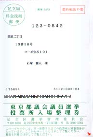 選挙はがき。採集日は2001年6月18日。今日は都議会議員選挙だ。アイス食べつつ門をくぐろうとしたら入り口で止められてしまった。いいじゃねーか、それぐらい。 根本的なことをいえば、選挙へ行くことに特に意味は感じないのだが、ずるずると選挙に行くことが続いている。こういう優柔不断なところが私の悪いところだ。 いままで、引っ越しの関係で投票できなかったことは何回かあるが棄権したことはたぶん一回ぐらいしかない。 翌日、小泉人気からジミントー勝利をうけての追記:日本人(都民)は物忘れがはげしいと思うのは、私だけじゃないよな? 追記(2001年8月7日) |