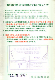 採集日1999年3月25日。生まれてはじめてみた水道の停止ハガキ。電話、電気、ガスはあったけど、水道までなあ……。いや、そんな哀れみの眼で見なくてもいいんだけど。単純にものぐさなだけだから……。