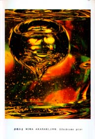 日曜日、誘われてカレイドスコープを見に行った。実は、「なんでカレイドスコープ?」という思いもなかったわけではない。というのは、万華鏡なるものは子供の頃にうちにもあって、それがあまりにもちゃちだったため、くだらないおもちゃ、とるに足らない映像装置という脳内分類箱に投げ込まれていたからだ。が、しかし、そこで見たものは、「具象と抽象の間に広がる視覚ドラッグ」というか、なんというか、ともかくとてつもないものだった。カレイドスコープの作家などという立場が、成立するか? とかそういうことを考えたこともなかったが、私などが知らなくても、実はしっかりと根付いているらしい。 このはがき、赤崎みまさんのものなのだが、これは自らが作ったゼリーを写真に撮ったものだ。赤崎さんの作品を見ると私は具象と抽象というその境目がよくわからなくなってしまう。 採集は1998年4月14日 |