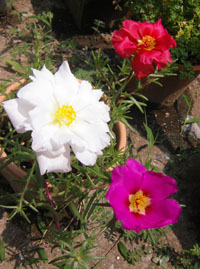 家の奥さんが骨董市の福引きでその種を貰ったのはいつだったか。おそらく二カ月を遡らないだろう。マイクロメートル・オーダーの種をダメモトでまいたら、わりとよく芽が出て、先週あたりから日にふたつ、みっつと咲いている。今のところ出たのは、赤、黄、白、ピンク、薄いサーモンピンクあたり。もっと色があるか? |